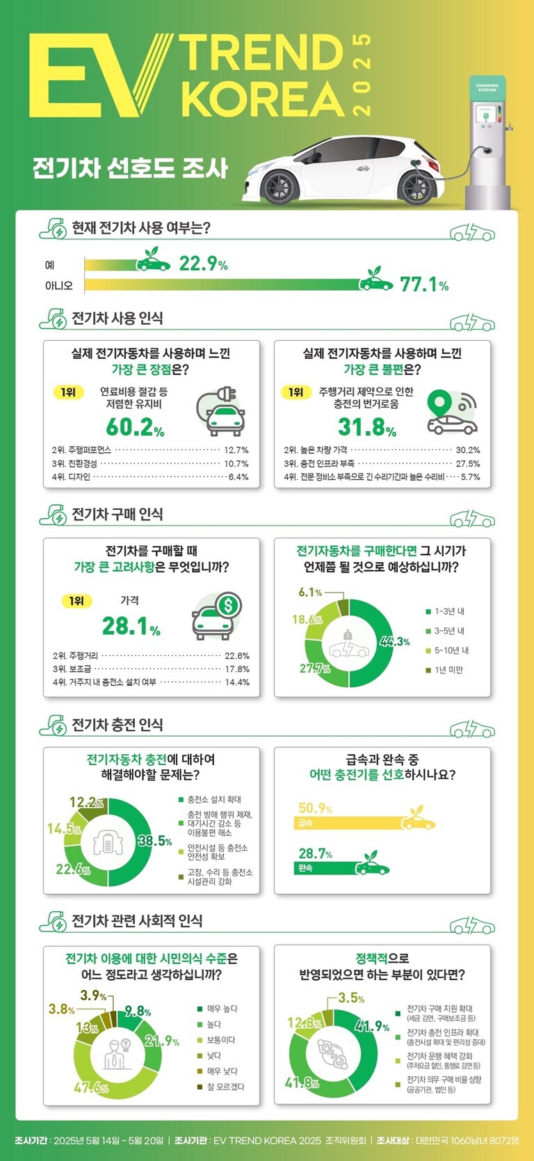 조사 결과에 따르면, 응답자 중 전기차 이용자는 22.9%, 비이용자는 77.1%로 나타났습니다. 이는 아직 전기차가 보편화되지 않았지만, 이미 상당수의 사람들이 전기차를 경험하고 있음을 보여줍니다. 특히 주목할 점은 비이용자 중 77%가 향후 전기차 구매 의향이 있다고 응답했다는 것입니다.