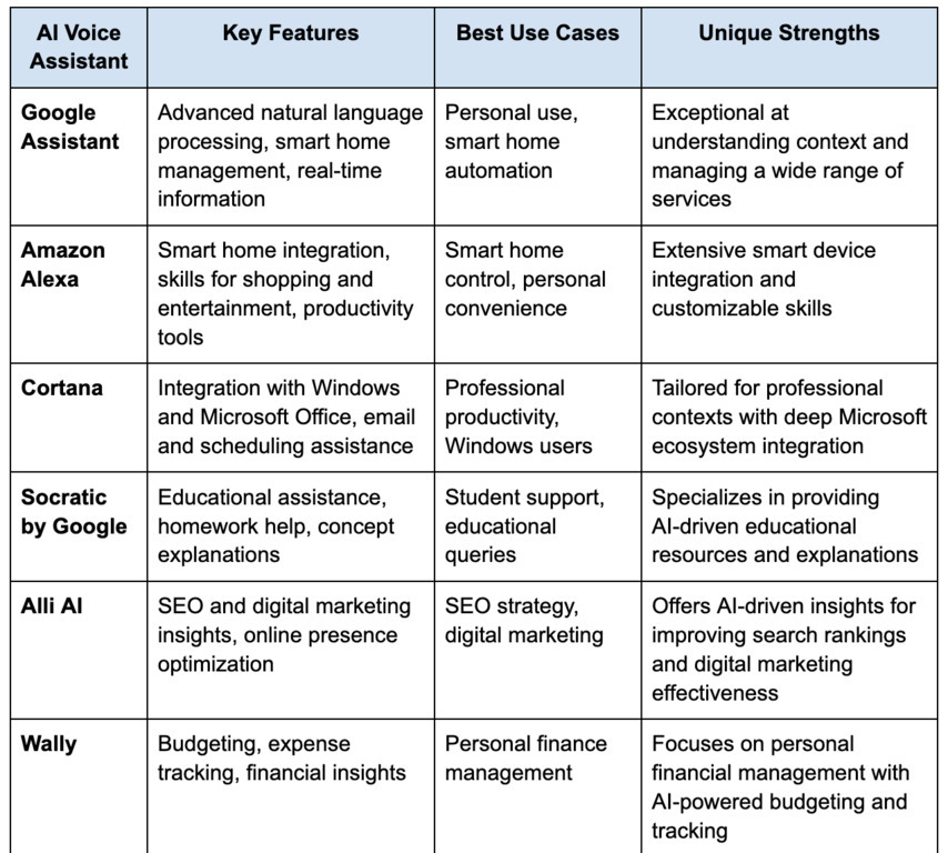 여섯 가지 AI 음성 비서(Google Assistant, Amazon Alexa, Cortana, Socratic by Google, Alli AI, Wally)의 주요 기능, 최적 사용 사례 및 고유 강점을 비교한 표